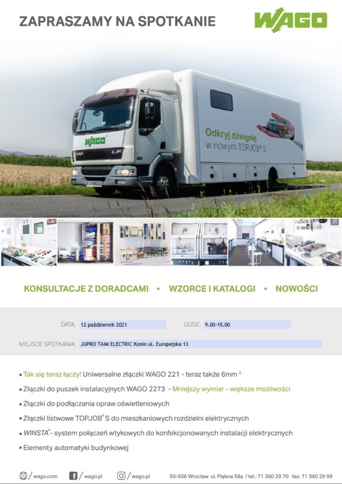 Zapraszamy na spotkanie z konsultantami WAGO, które odbędzie się w dniu 12.10.2021 w godzinach 9.00-15.00 w naszej siedzibie Jupro Taim Electric